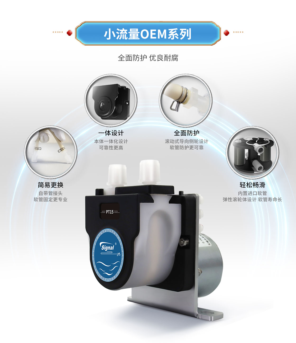 流量范圍:1.40-25.20mL/min 交流同步電機(jī)驅(qū)動 此款蠕動泵為彈簧型泵頭 維護(hù)方便、可靠性高、噪音小 一體化支架設(shè)計(jì),可靠性高 滾動式導(dǎo)向側(cè)輪設(shè)計(jì)軟管防護(hù)更可靠 滾輪體采用PA66+MoS復(fù)合材料,更耐磨,使用壽命更長