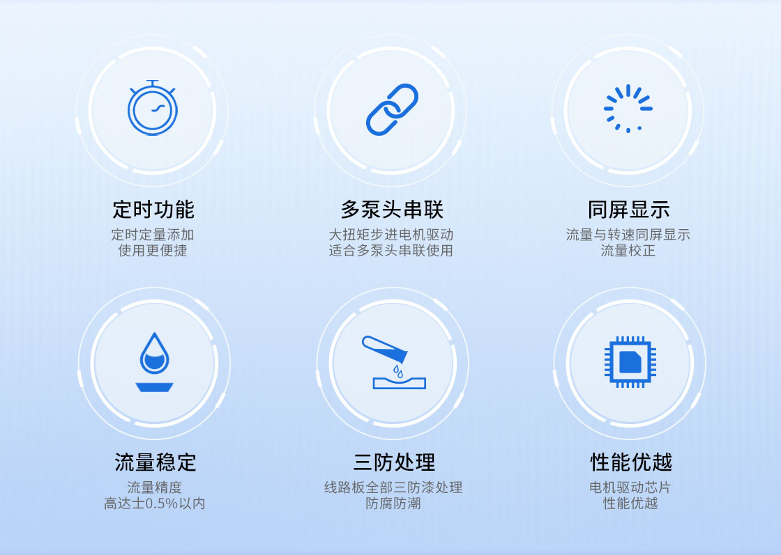 2.大扭矩步進電機驅動,適合多泵頭串聯使用;